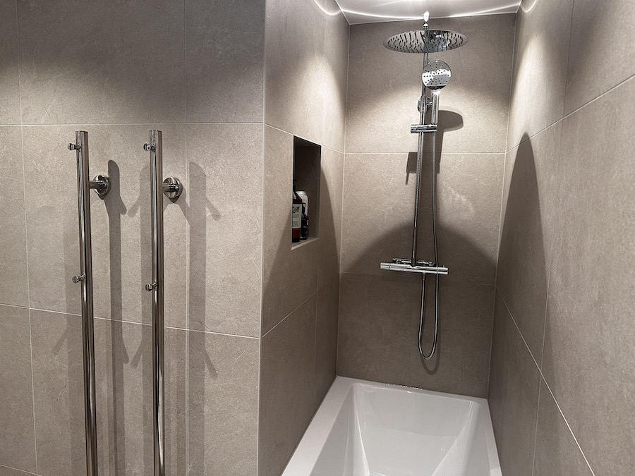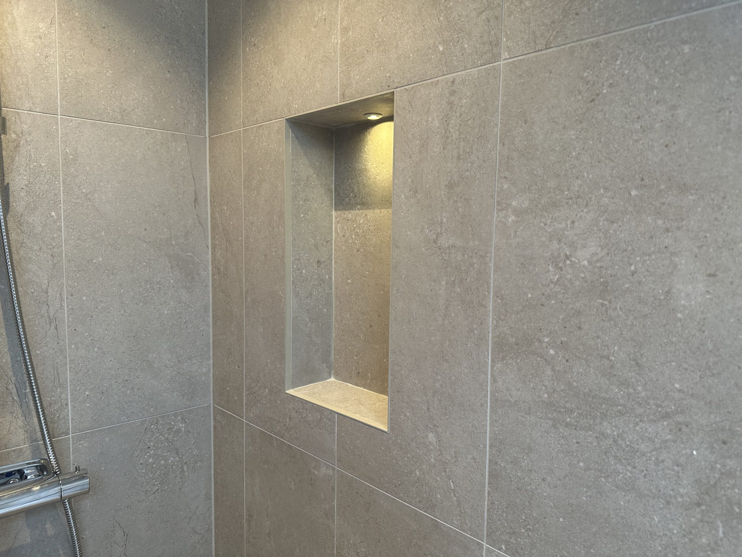 Att bygga in en tvålhylla i väggen är både praktiskt och snyggt.