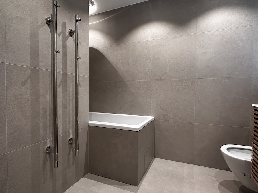 Den vägghängda wc-stolen kläs in med våtrumsskivor och kakel. Vid inklädnad finns det två alternativ; den korta modellen som gör att man får ett hyllplan över eller att den kläs in som en pelare ända upp till taket. Då kan man även fälla in en hylla i denna pelare.